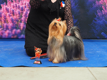 Temperamentní povaha, ladný pohyb v běhu s rovnými zády, nůžkový skus, vyš. na luxace pately 0/0, rovný krátký hřbet, hedvábná srst (tmavě ocelově modrá), váha 2,4 kg, výška 23 cm